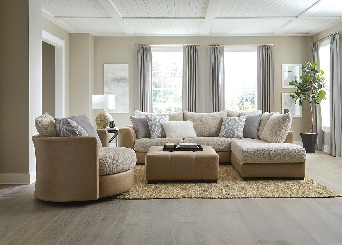 Sofa, Loveseat, and Accent Chair in neutral fabrics with brown accents