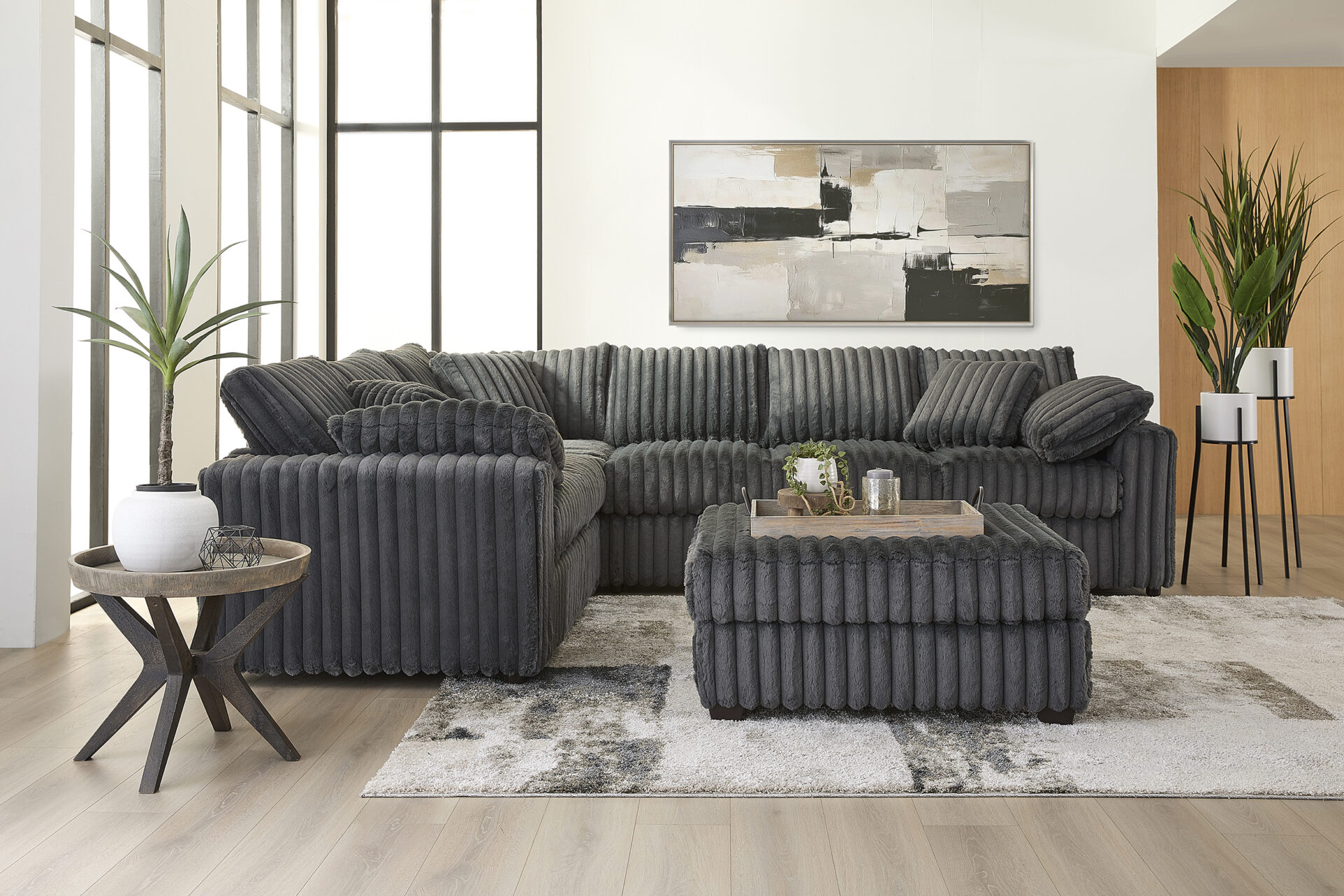 Two-piece charcoal sectional sofa with ottoman, available at Best Mattress & More in Mobile, Alabama