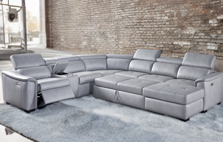 Four-piece harbor grey power reclining sectional with pull-out bed and power-back storage chaise, available at Best Mattress & More in Mobile, Alabama.